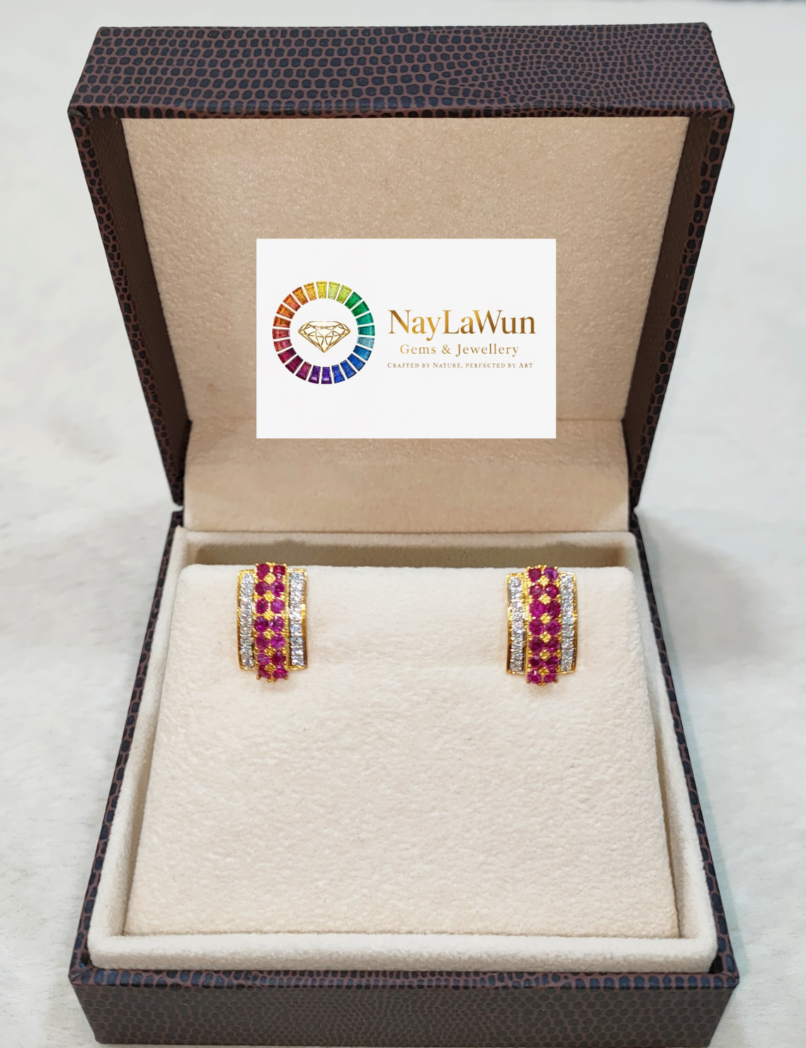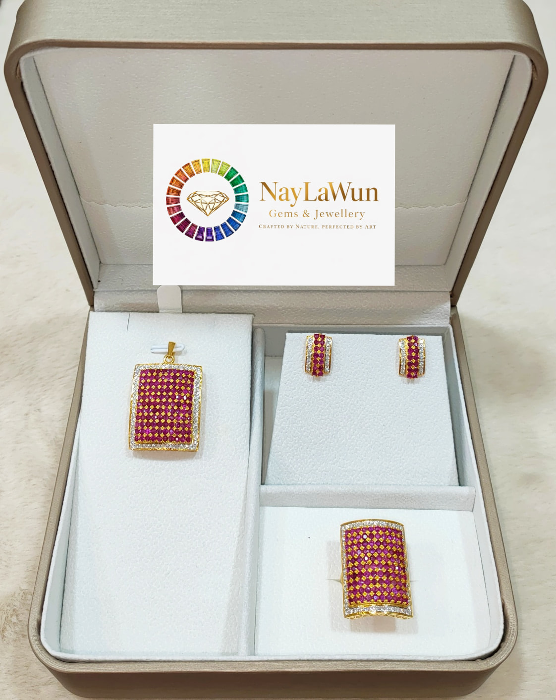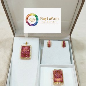The beauty of rubies and diamonds combined to create a beautiful and elegant piece of jewelry. A set of earrings, pendants and rings made of natural rubies and diamonds.